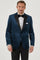 Jive Teal Velvet Tailored Jacket in luxurious velvet with satin peak lapels and geometric patterned lining. Features a refined tailored fit, single button closure, and flap waist pockets. Twin side vents and cloth-covered buttons complete the sophisticated design. Perfect for formal events and special occasions. 100% polyester; dry clean only.